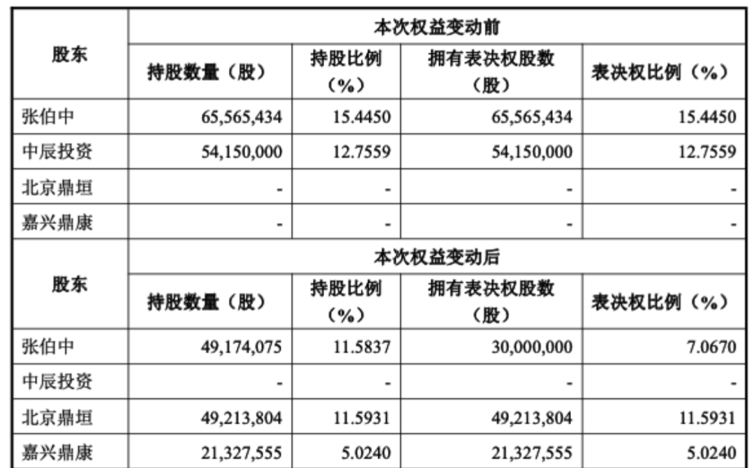 根据协议,张伯中将其持有的1639.14万股公司股票(占公司总股本的3.8612%)转让给嘉兴鼎康万德资本,中辰投资将其持有的493.62万股公司股票(占公司总股本的1.1628%)转让给嘉兴鼎康,中辰投资将其持有的4921.38万股公司股票(占公司总股本的11.5931%)转让给北京鼎垣。