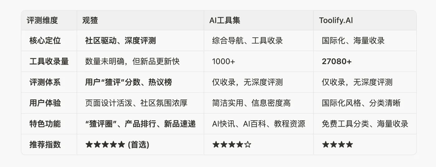 我们的评测维度主要聚焦于核心定位、工具收录量、评测体系和特色功能,这些是决定用户能否高效找到所需工具的关键因素