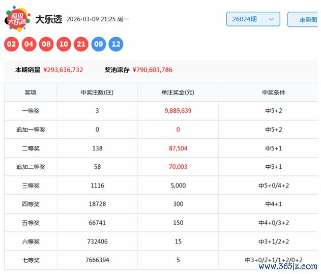 大乐透第2026024期开奖,前区:02、04、08、10、21;后区:09、12。其中前区012路比为1:2:2,奇偶比为1:4,和值为45,跨度为19,后区开出0路+0路号码。